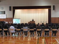 1月20日(火)1校時、本校体育館で始業式が行われました。大寒の暦通り、凍てつく寒さの中で久し振りに登校した生徒たちが元気よく校歌を斉唱した後、近藤校長先生から3学期に向けてのお話がありました。また福祉デザイン科の生徒3名による作文発表もあり、それぞれ2学期に頑張ったこと、3学期に頑張りたいことなどを落ち着いて堂々と発表していました。その後、冬休み中に行われた道南3校(本校・北斗高等支援学校・今金高等養護学校)による『第6回道南カップ・スポーツ交流大会』の表彰があり、バドミントンとバスケットボール両方の競技で勝ち残り、総合優勝の三冠を果たしたチームの2年生6名が、校長先生から表彰状と優勝カップを授与され、生徒・教職員全員から祝福の拍手を受けました。式の後、進路支援部より来月6日に実施される毎年恒例の卒業生による『職業講話』の説明があり、生徒たちは熱心に耳を傾けていました。
